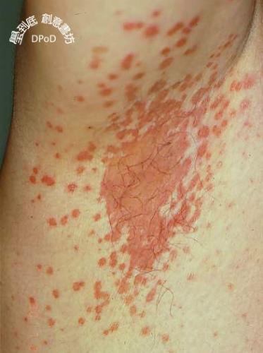 38歲男性主訴在兩腋下發生稍癢的紅疹有往外拓展的趨向一週之久