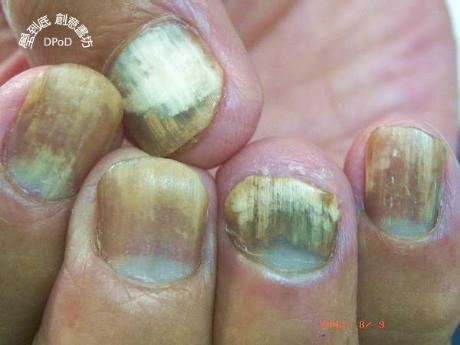 63歲男性主訴指甲變黃變厚雖無不適,但外觀很難看已有兩年。病人另有C型肝炎2年多,肝功能指數(GOT,GPT)在100多至200多。