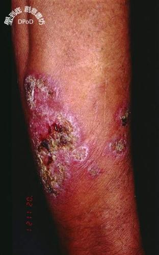 60歲男性主訴右手不癒之紅色結痂斑塊已有三個多月了。