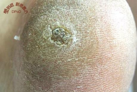 | 腳底的人類乳突狀病毒感染,造成腳底局部角質層增生,並由於走路壓力關係把它壓入皮膚內,造成像雞眼般的外觀及疼痛症狀。與雞眼的區別是疣中央有黑色的點狀特徵(那是因有血管往上增生並有小小出血凝固的現象),而雞眼則只有角質層變後變黃變硬,另外雞眼必長在骨頭凸出造成壓力點的部位,而疣則不一定。 |